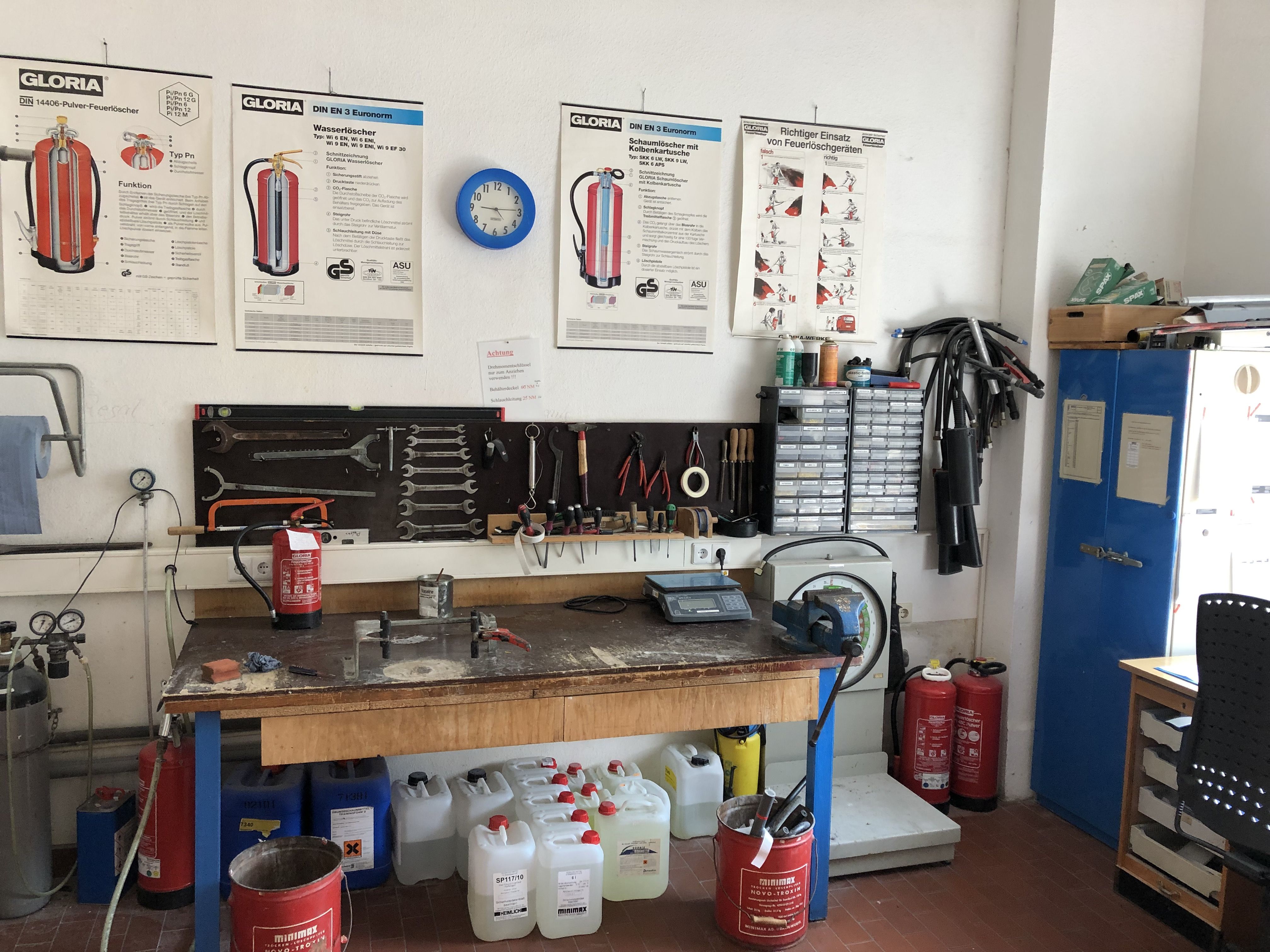 Geprüft werden hier während des Alarmdienstes Wasser-, Pulver- und Schaumlöscher.